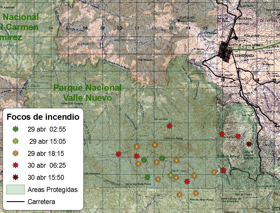 Así ha avanzando el fuego en #SOSValleNuevo. Nuevo foco cerca de Col. Japonesa y Constanza (Data MODIS/NASA)