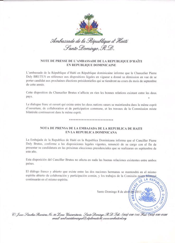 En un comunicado de prensa que se pública completo más abajo la embajada haitiana confirma los motivos de la renuncia del canciller haitiano. Será candidato preswidencial en las elecciones de noviembre de éste mismo año.