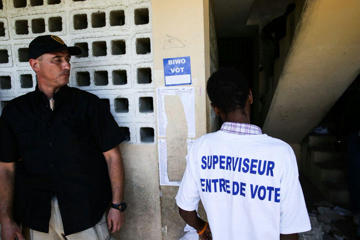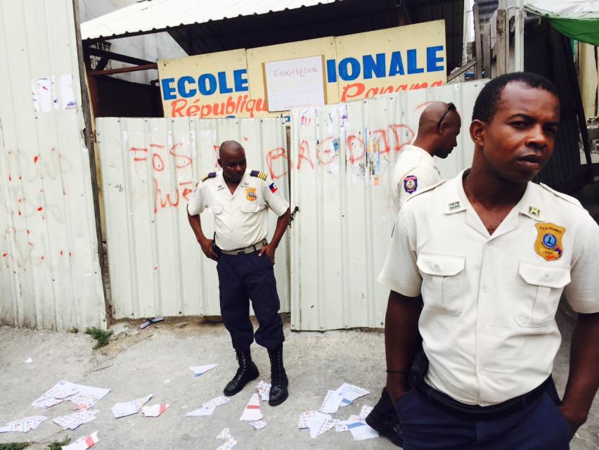 Police just arrived at Rue Vaellant where the voting was shut down and workers inside. Problem over monitors. #Haiti