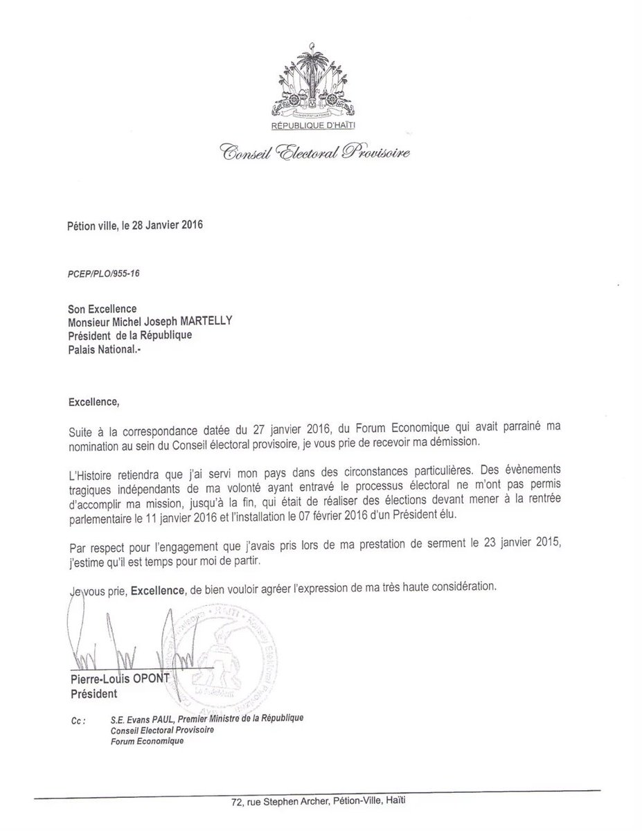 Opont hizo oficial su dimisión en una misiva enviada al presidente del país, Michel Martelly, con fecha del 28 de enero.Más detalles en breve