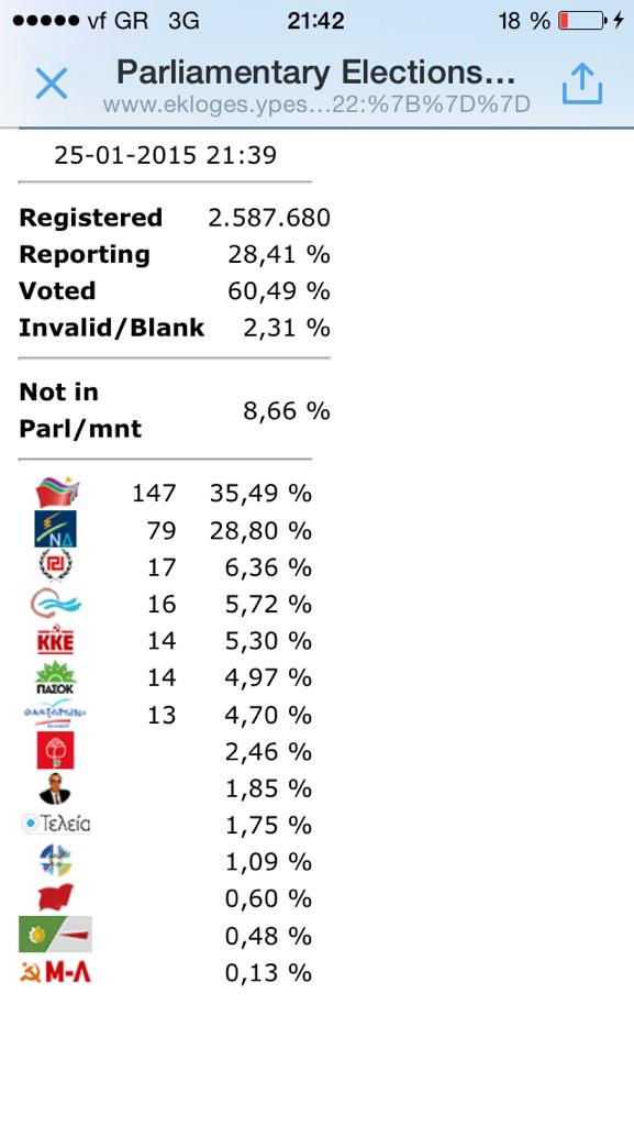 Datos oficiales. Con el 28% escrutado Syriza suma 147 escaños. Esta a las puertas de la mayoria absoluta -151