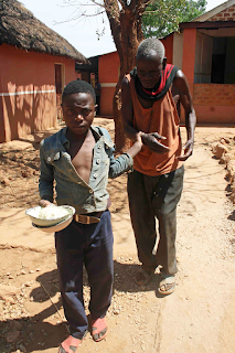 Primero, nuestra pequeña Natasha, con su sonrisa de siempre llega con Laston quien acaba de cumplir un año y medio. Hace poco tiempo que el bebe logra ponerse de pie y necesita a alguien para ayudarle en sus caminatas. Así Natahasha Lo agarra de la manita para evitar que se caiga y ambos caminan mano en la mano hasta nuestro comedor. Cinco minutos más tarde, llegan Patfrey un muchachito de 11 años y nuestro abuelo Benny quien tiene casi 90 años de edad. Ba Benny está casi ciego y sus piernas le duelen mucho. El necesita la mano de alguien para caminar. Tres veces al día, uno de los muchachos lleva de la mano al anciano para ayudarle a llegar a donde él necesita ir.