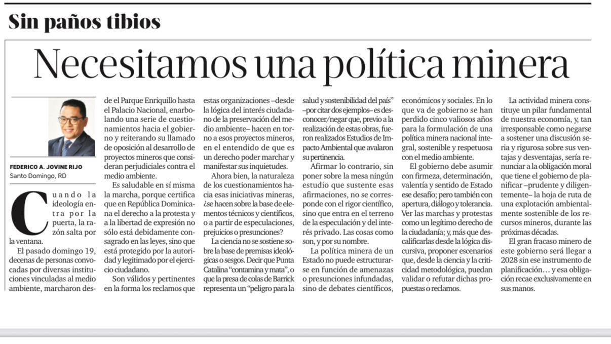 Bastaría con una sola visita al lugar de los hechos para constatar la grave situación que allí se vive fruto de la contaminación directa de la Presa de Colas que ya existe. Usted parece vivir en otro país que no es en el que yo vivo, y parece escribir con desconocimiento total de la realidad de su pueblo, parece que sus palabras responden más bien a otros intereses que no los genuinos de todo periodista, de decir la verdad, como aprendí en la UASD cuando estudiaba lo que se supone también estudiaba usted en alguna universidad.