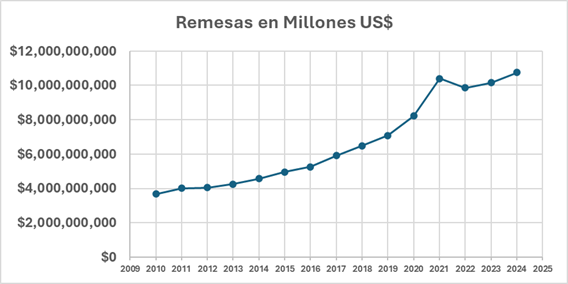 En los últimos quince años, las remesas han experimentado un aumento notable. En el año 2010, estas alcanzaban los 3,682 millones de dólares, mientras que para 2024 el monto total de remesas familiares recibidas ascendió a 10,756 millones de dólares, lo que representa un incremento del 192 %. No obstante, es importante considerar el efecto de la inflación durante este período.
