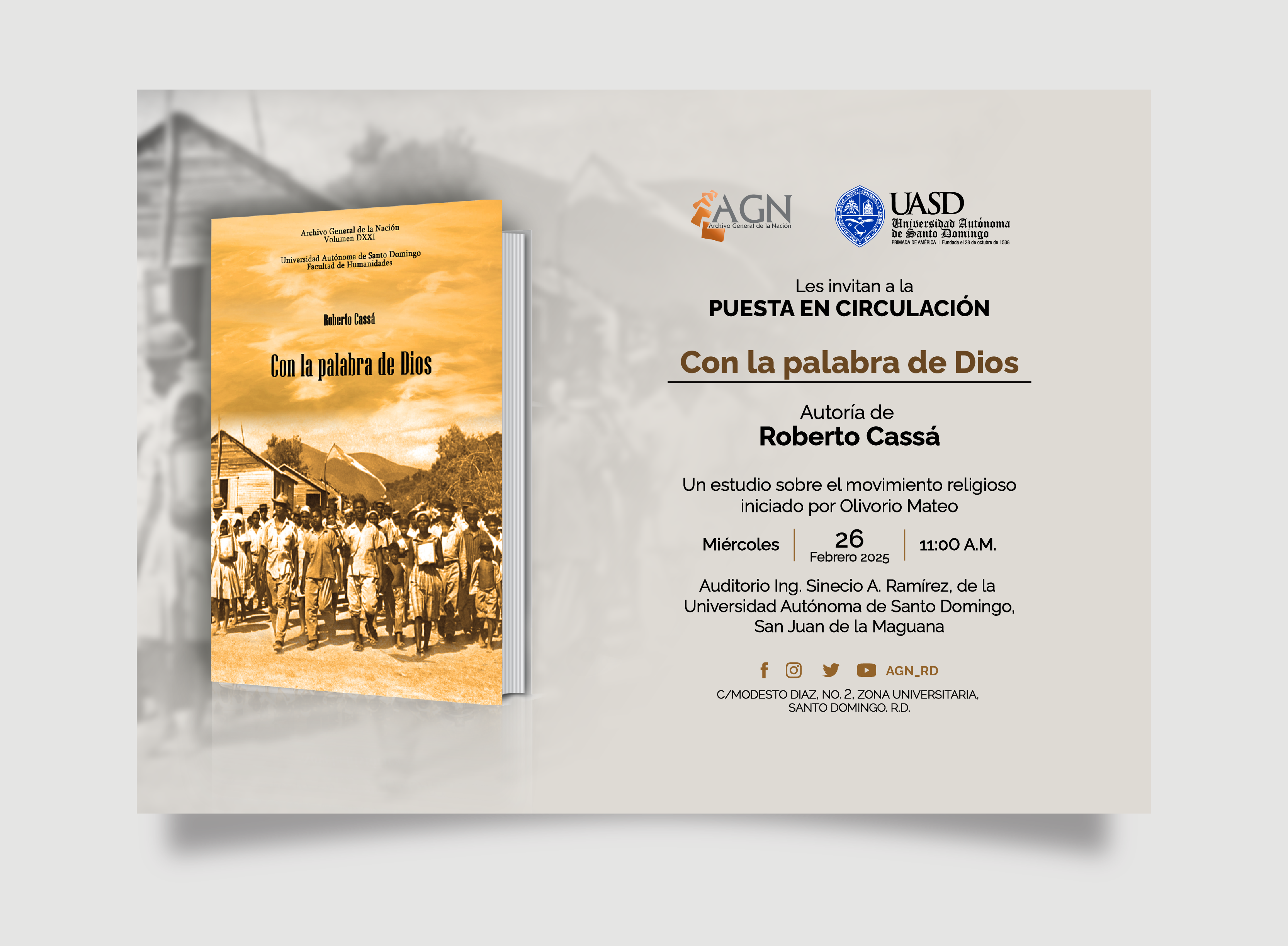 El Archivo General de la Nación (AGN), en colaboración con la Universidad Autónoma de Santo Domingo (UASD), presentará el libro Con la Palabra de Dios, una obra del historiador Roberto Cassá, que explora el movimiento religioso liderado por Olivorio Mateo en la República Dominicana.