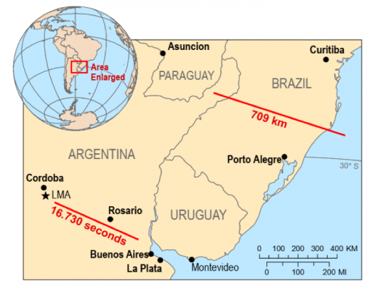 Ginebra, 26 de junio de 2020 (OMM) – Un comité de expertos de la Organización Meteorológica Mundial (OMM) ha establecido dos nuevos récords mundiales: el mayor alcance y la mayor duración jamás registrados para un único rayo en el Brasil y la Argentina respectivamente.