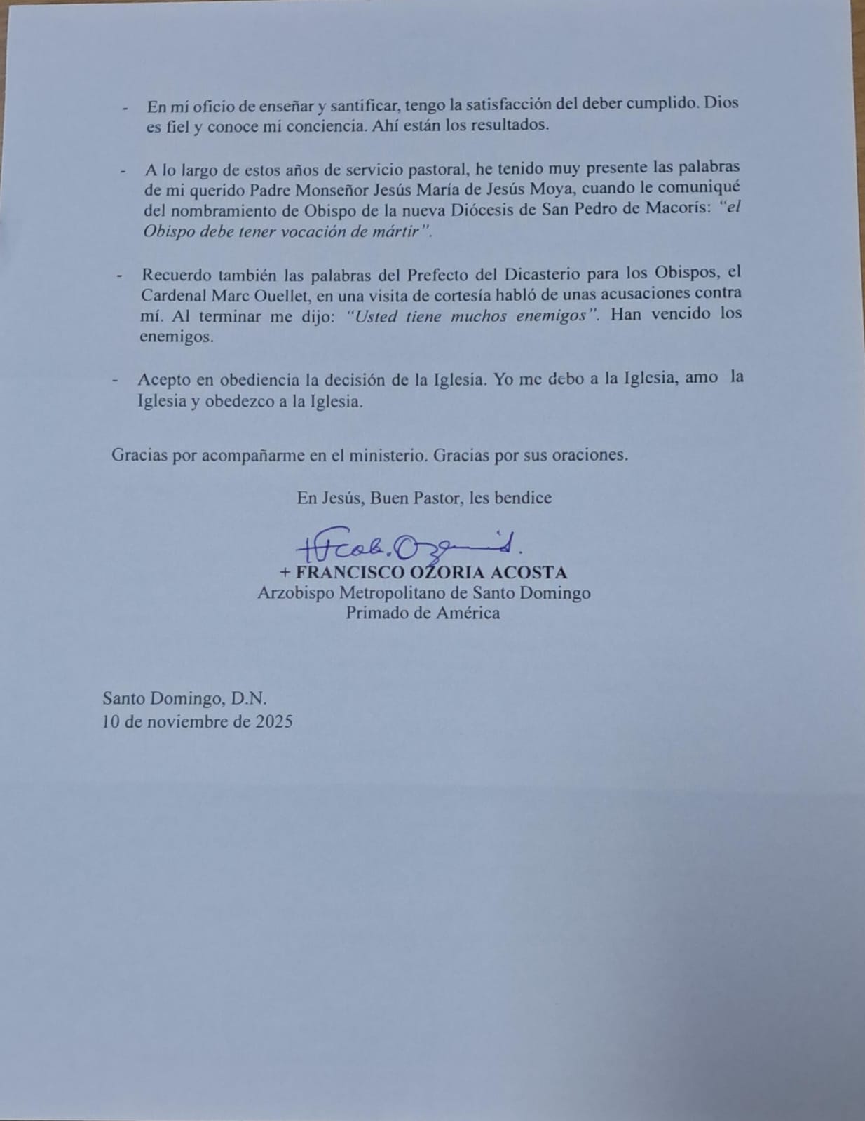 "Según las Letras Apostólicas, se me suspende por mala administración. Así hay que entenderlo. Nunca se me amonestó o advirtió", manifestó Ozoria Acosta en la carta.