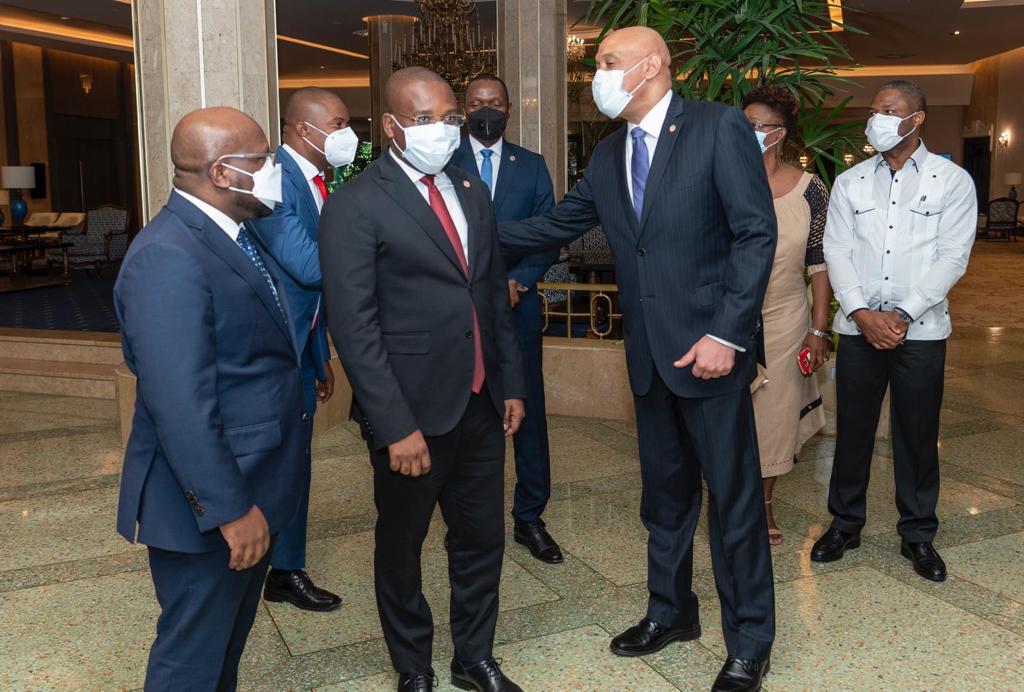 El canciller haitiano junto al embajador haitiano en Santo Domingo, doctor Smith Augustin y miembro de la delegaciòn que le acompaña en su viaje a la Repùblica Dominicana
