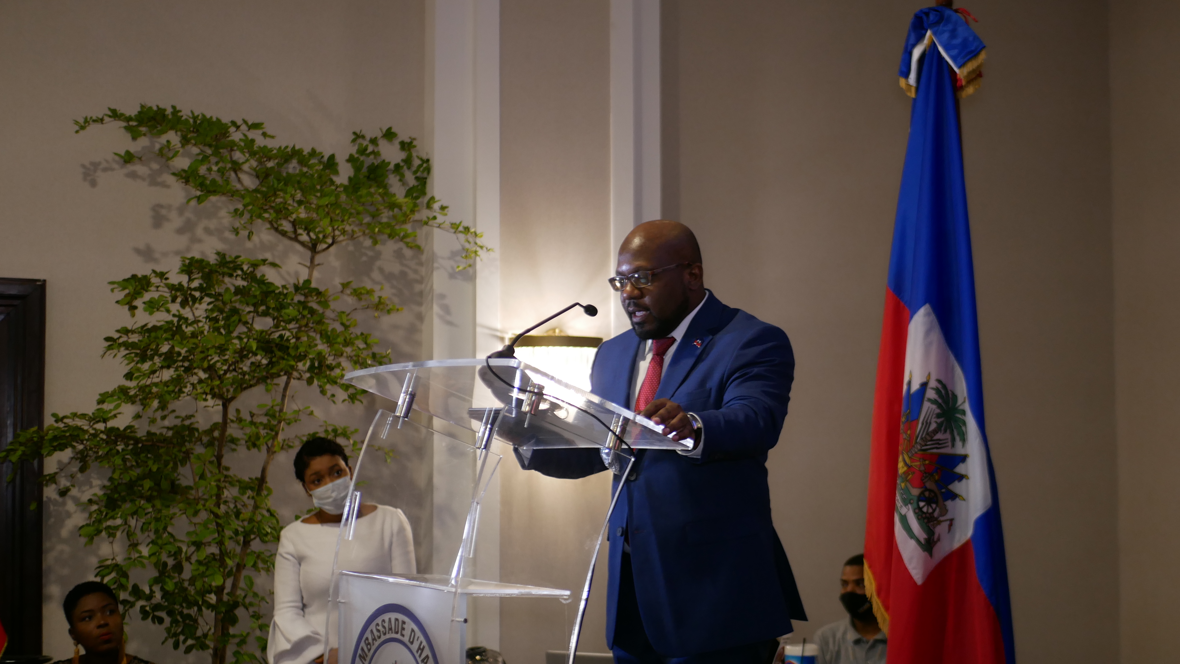 El doctor Smith Augustin pronuncia el discurso de orden durante el acto a la bandera haitiana celebrado en el Hotel Embajador, salón Embajador el martes 18 de mayo de 2021, organizado por la Embajada de Haití en la República Dominicana