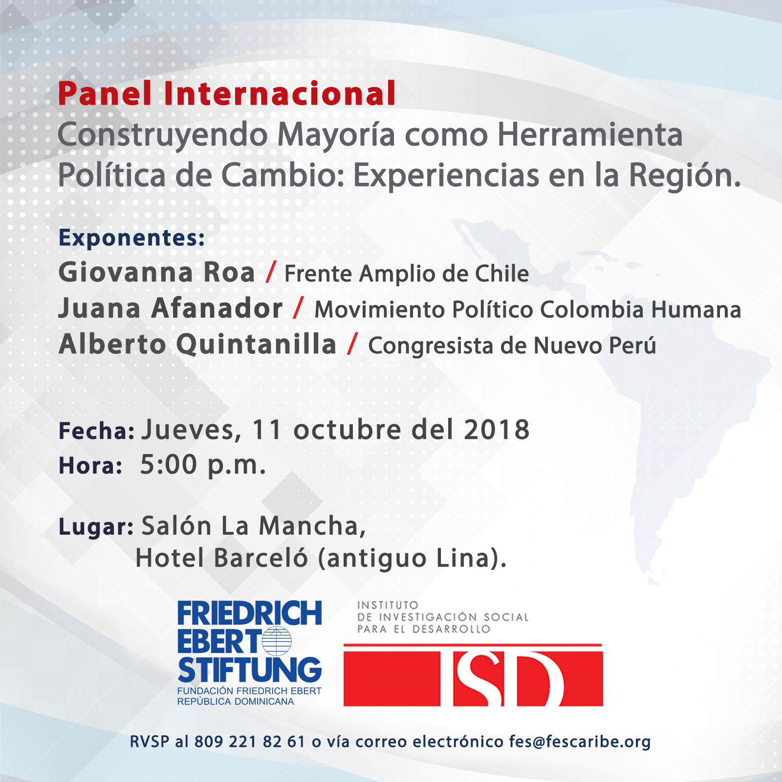 La Fundación Friedrich Ebert en la República Dominicana y el Instituto de Investigación Social para el Desarrollo (ISD) celebrarán el próximo jueves 11 de octubre en el Hotel Barceló el panel titulado "Construyendo Mayoría Como Herramienta de Cambio Político.