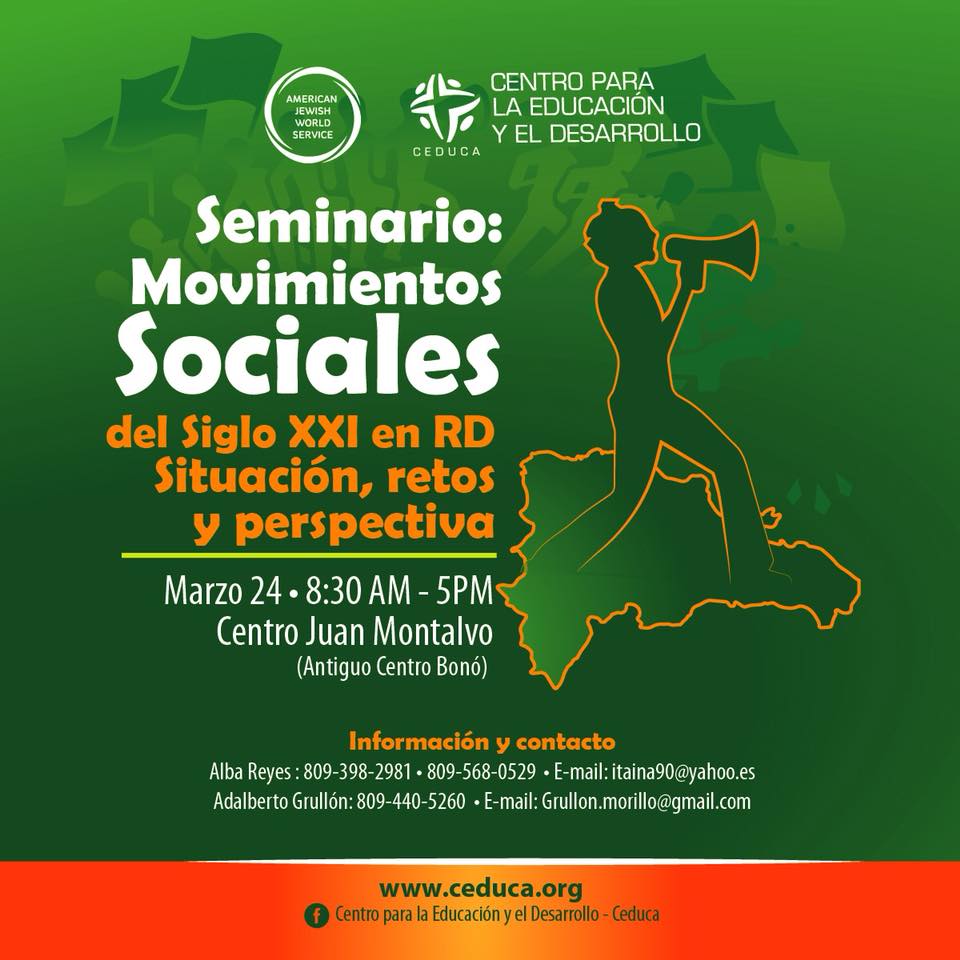 Cerca de un centenar de dirigentes sociales, académicos y profesionales participaran este sábado 24 de marzo en el Seminario “Movimientos Sociales del Siglo XXI en la República Dominicana: Situación, retos y perspectiva”, que busca analizar la experiencia de los movimientos sociales registrados en la última década en el país.