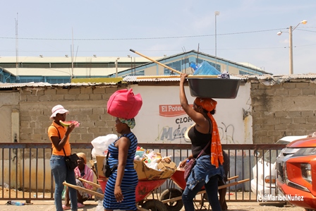En esta responsabilidad histórica que hemos asumido las mujeres negras, afrocaribeñas, en respuesta a situaciones económicos-sociales y cimarronas, a participar en el mercado informal de producción, venta y compra, ahí se les ve, en el regreso a Haití, con todo lo comprado en una carretilla, cargando huevos, víveres diversos (guineítos, yuca, batata, plátanos), vegetables, arroz, pastas, pollos, productos de limpiezas, aceites… un sin fin de productos, que incluso marcan rapidez como los goteantes bloques de hielo.