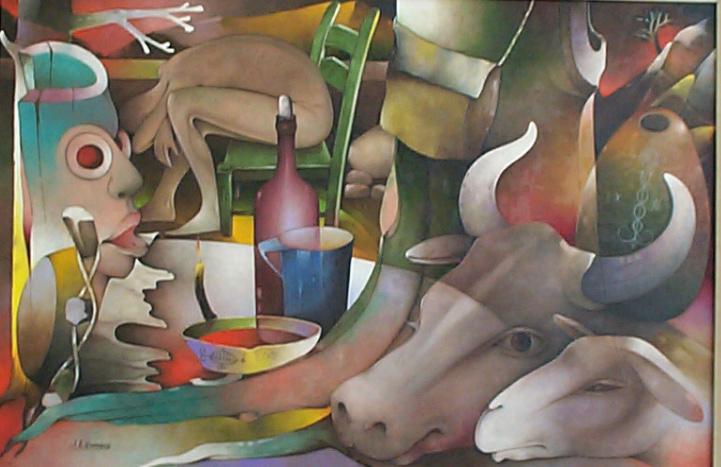 Sa toile Le reposoir offre une merveilleuse manière de lire une situation obscure du milieu haïtien en associant des objets du culte vodou avec des êtres non-vivants et vivants. En observant les détails reproduits sur cette toile, nous constatons qu’il s’agit d’une œuvre qui bouscule les conditions de la vision ordinaire en peinture haïtienne par rapport à ses prédécesseurs et contemporains. Ce qui est exceptionnel, ce n’est pas le motif en soi, mais la façon dont le volume a été créé sans rompre l’harmonie du tableau, son unité de ton ou la densité pigmentaire de sa surface. L’ensemble du tableau baigne dans un environnement tragique où l’individu est contorsionné.
