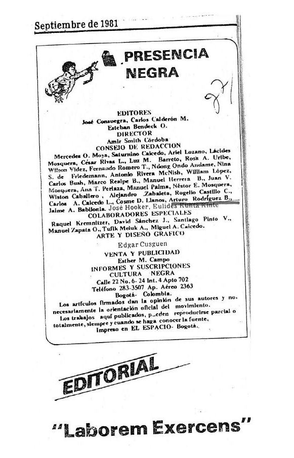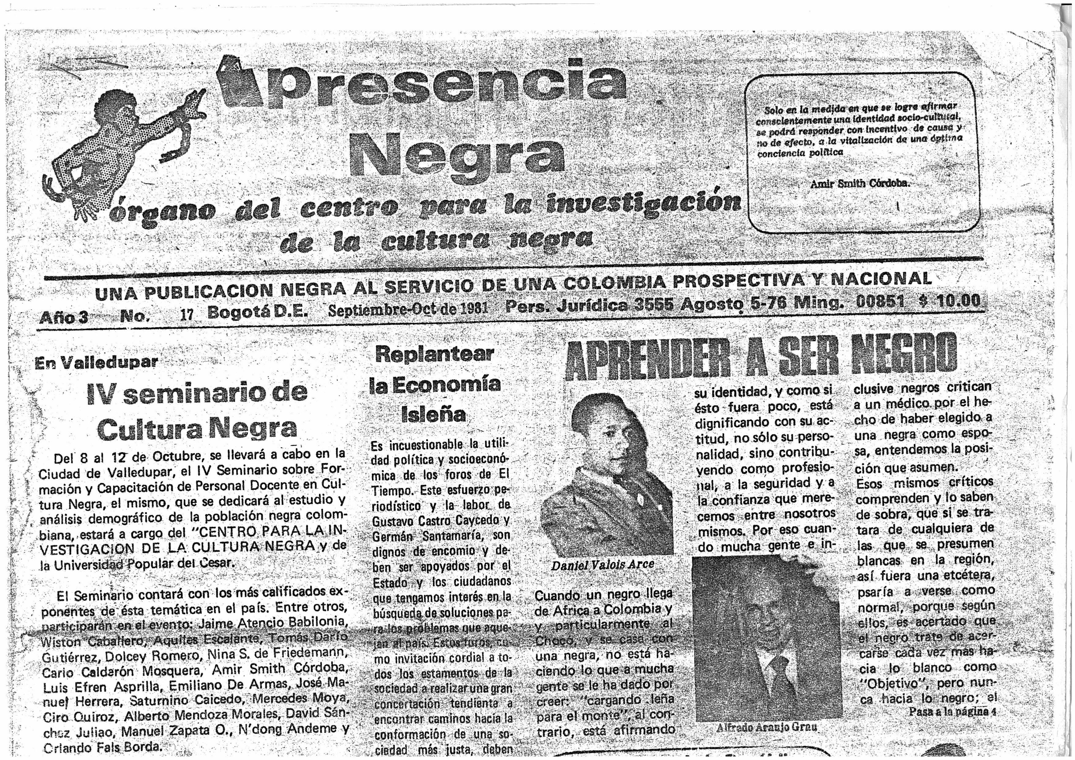 En la capital colombiana en 1975 cofundamos, con Manuel Zapata Olivella, Amir Smith Córdoba, Amilkar Ayala, Eduardo Díaz, Nicolás Murillo, Leonor Murillo, Doris García y Nina De Friedmann, el “Centro de Estudios Afrocolombianos, ‘Movimiento Joven Internacional, José Prudencio Padilla, Cultura Negra e India en Colombia”. El objetivo de este colectivo fue estudiar la presencia africana en Colombia para fundamentar una identidad psíquica-cultural en la población negra en Colombia.