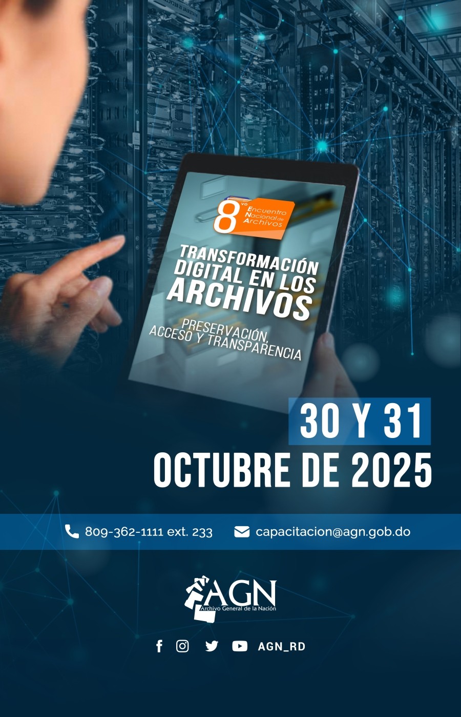 Santo Domingo. - El Archivo General de la Nación (AGN) celebrará la 8.ª edición del Encuentro Nacional de Archivos (ENA) los días 30 y 31 de octubre, con el tema “Transformación digital en los archivos: preservación, acceso y transparencia”.