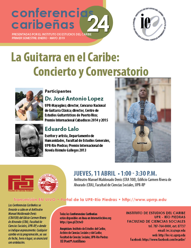 CC24 Dr. José Antonio López y Eduardo Lalo - “La Guitarra en el Caribe: Concierto y Conversatorio”, 11 de abril de 2019, CRA 108, Fac. de Ciencias Sociales. El Instituto de Estudios del Caribe de la Universidad de Puerto Rico-Río Piedras (UPR-RP), invita a la comunidad universitaria y al público en general al concierto y conversatorio: “La Guitarra en el Caribe: