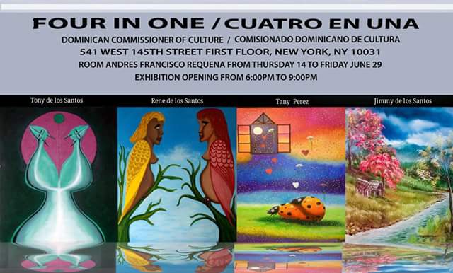 Nueva York- La exposición colectiva ‘Cuatro en Uno’, integrada por los hermanos pintores Tony, René, Jimmy de los Santos y Tany Pérez, será presentada en el Comisionado Dominicano de Cultura en los Estados Unidos, entidad del Ministerio de Cultura de la República Dominicana, del 14 al 29 de junio de 2018.