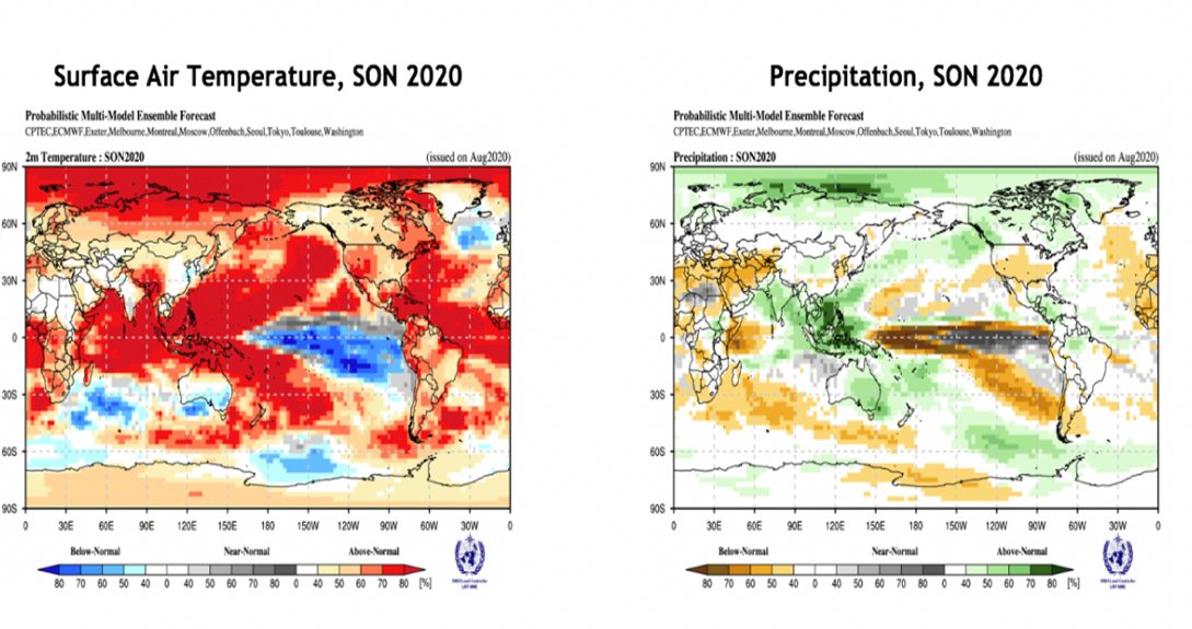 Las predicciones de los modelos y la evaluación de los expertos indican que la probabilidad de que se produzca un episodio de La Niña durante el período de septiembre a noviembre de 2020 es del 60 %, la probabilidad de que se mantengan las condiciones de un ENOS neutro es del 40 % y la probabilidad de que tenga lugar un episodio de El Niño es prácticamente nula. Para el período de diciembre de 2020 a febrero de 2021, la probabilidad de que se produzca un episodio de La Niña se reduce al 55 %.