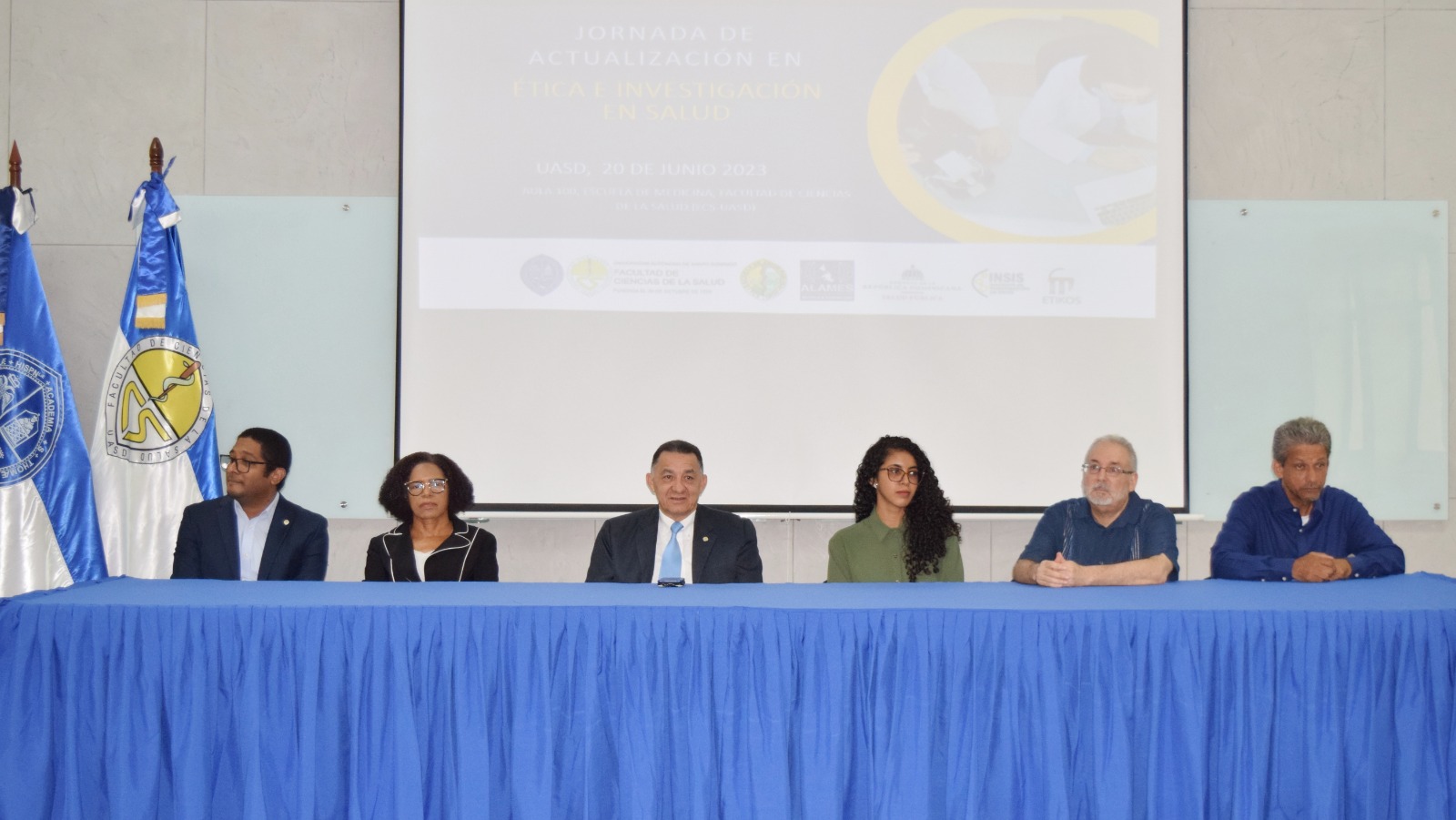 El acto de apertura fue encabezado por el Dr. Mario Uffre, decano de la Facultad de Ciencias de la Salud (FCS), Dr. Roberto Espinal, coordinador del capítulo dominicano de ALAMES, Matilde Peguero, directora de la Escuela de Salud Pública, Manuel Colomé, director del INSIS, José Selig, docente e investigador en salud y Penélope Parra, encargada de gestión del conocimiento de la Dirección de Investigación del Ministerio de Salud Pública (MSP).