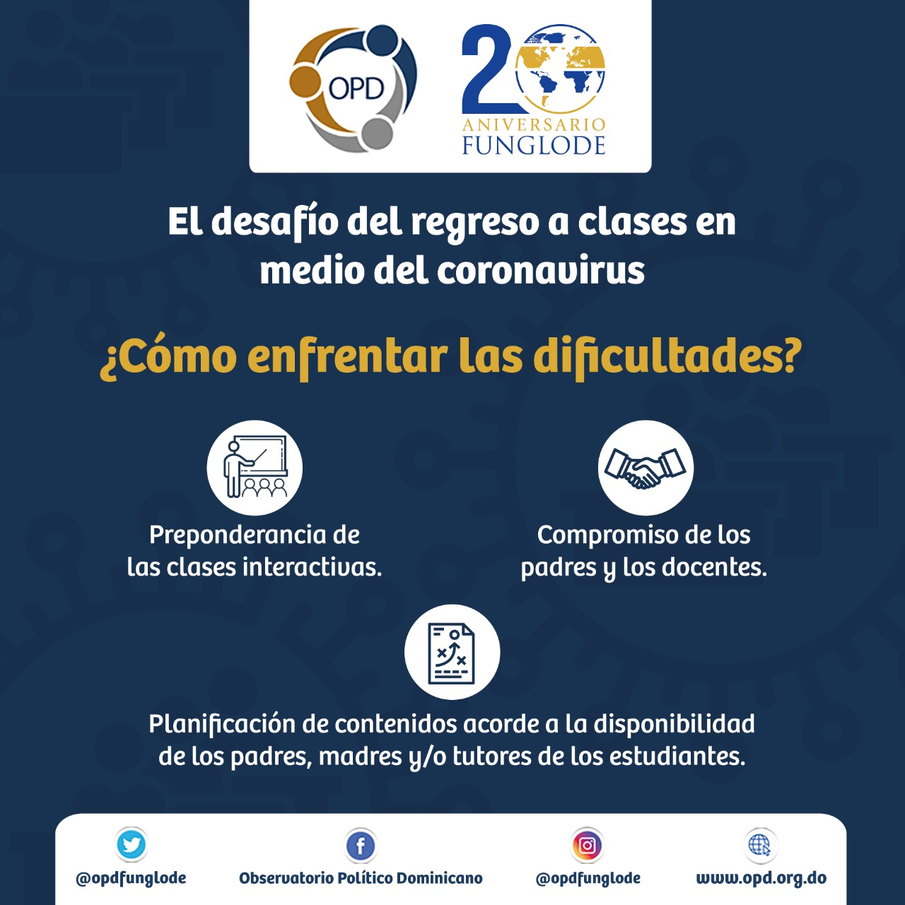 El Observatorio Político Dominicano (OPD), entidad adscrita a la Fundación Global Democracia y Desarrollo (FUNGLODE), publicó su más reciente estudio titulado «El desafío del regreso a clases en medio del Coronavirus», en el que establece los retos, desafíos y ventajas de la educación a distancia en República Dominicana producto de la pandemia del COVID-19.